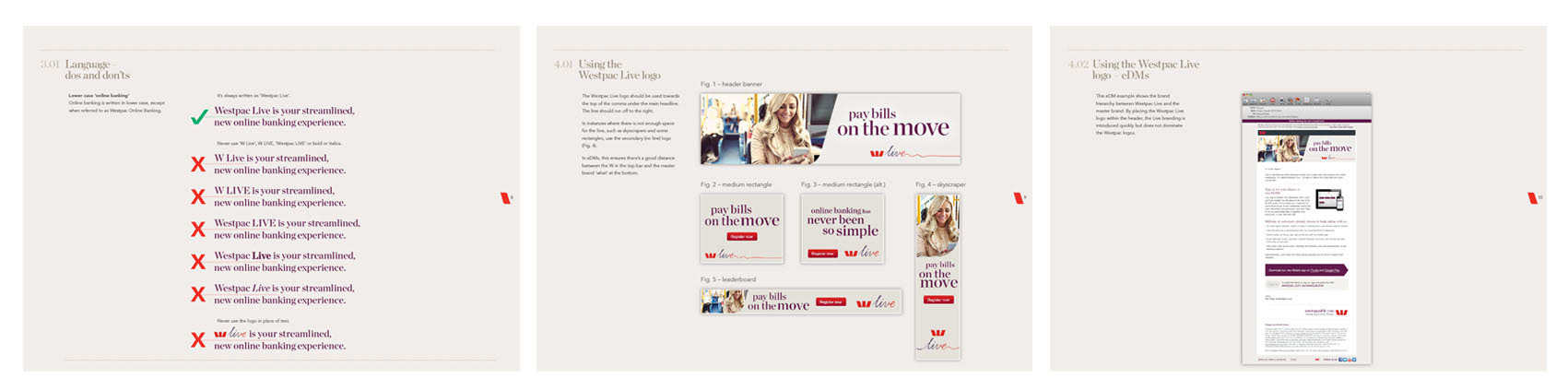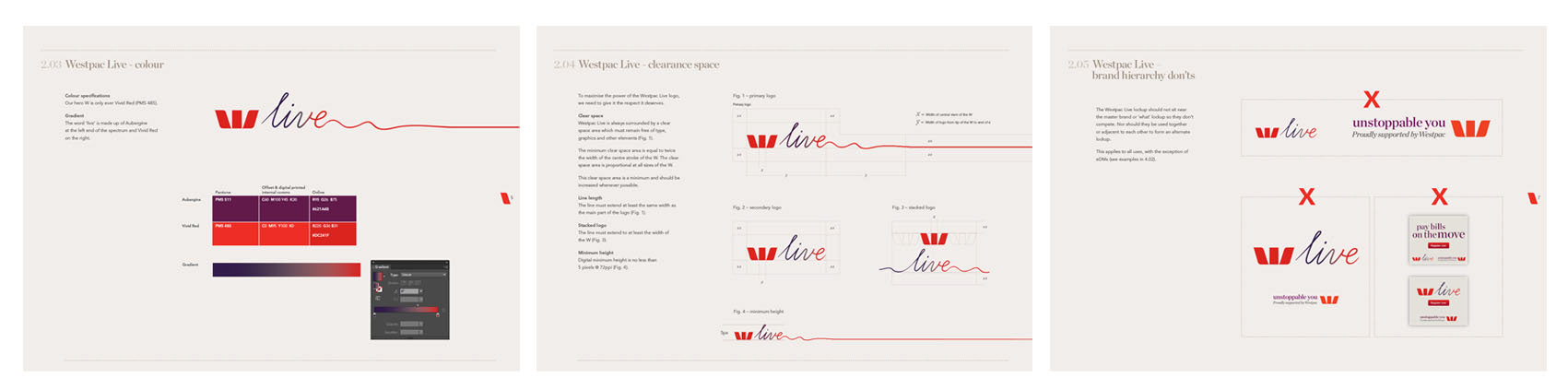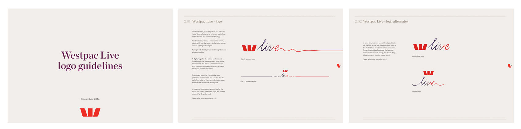 Brand guidelines created for Westpac's new 'Westpac Live' banking platform. With a lot of money invested in the launch, the new identity had to sit seamlessly with the current logo and work across a tonne of different executions.